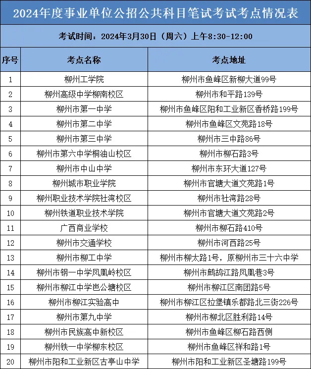 今年,25009名考生將在柳州市參加2024年度柳州市事業(yè)單位公開(kāi)考試招聘工作人員公共科目筆試,柳州市考區(qū)共設(shè)20個(gè)筆試考點(diǎn)。