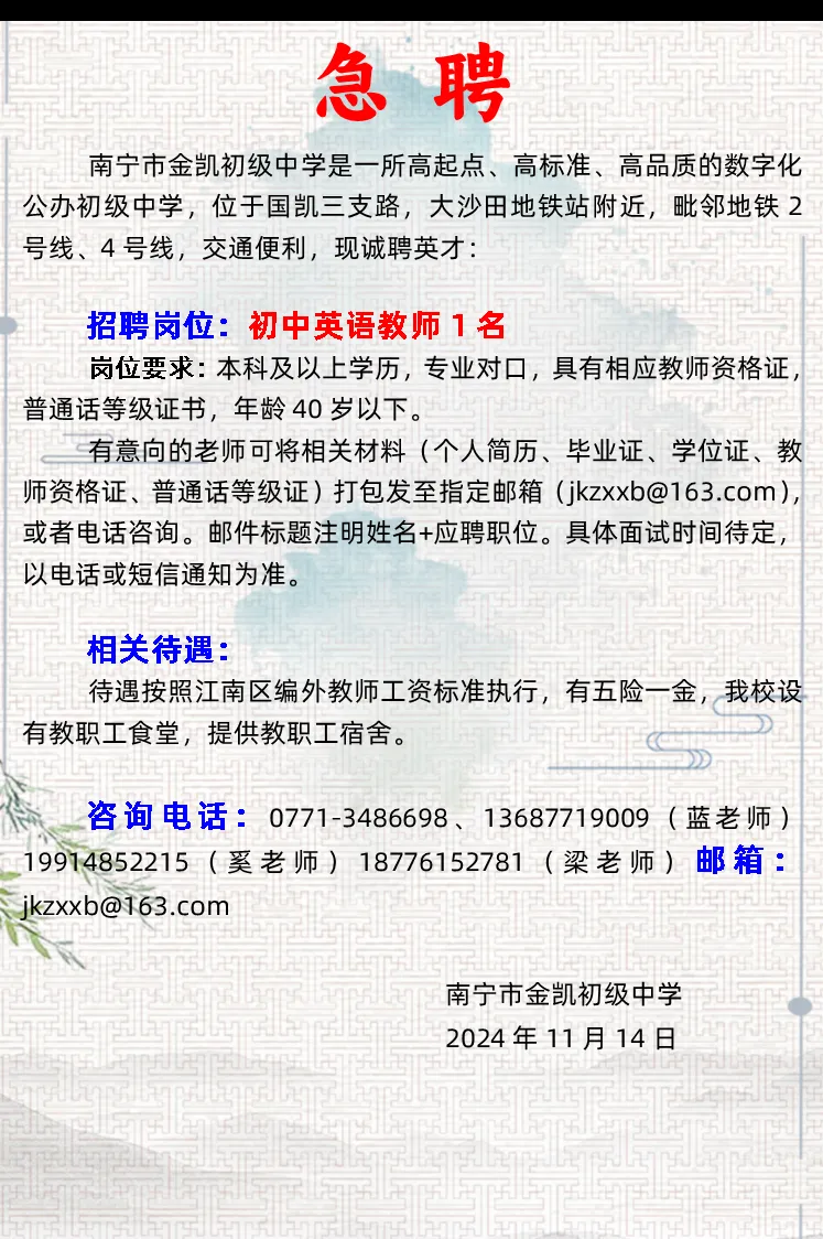 2024年南寧市金凱初級(jí)中學(xué)招聘英語(yǔ)教師1人