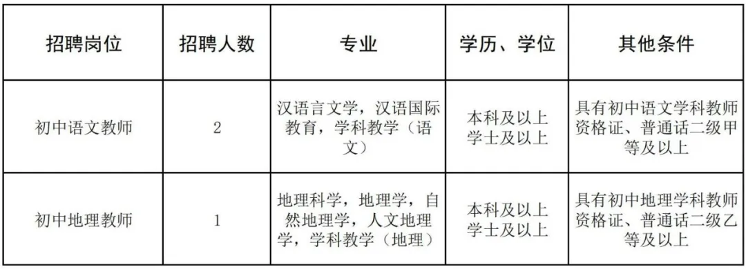 根據(jù)發(fā)展需要,學校擬招聘初中語文、初中地理頂崗教師共3人,具體招聘信息如下: