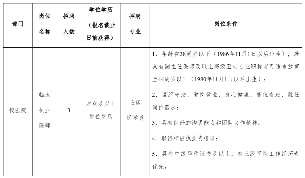 擬公開招聘醫(yī)務(wù)工作人員3名,具體崗位及相關(guān)條件要求詳見(jiàn)下表: