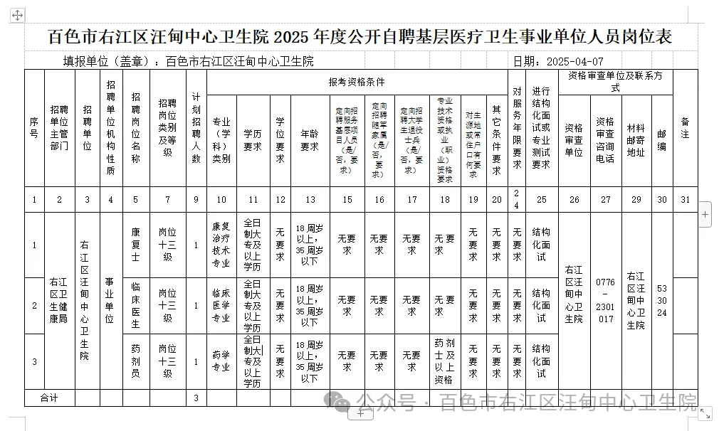 附:右江區(qū)汪甸中心衛(wèi)生院2025年度公開(kāi)自聘基層醫(yī)療衛(wèi)生事業(yè)單位人員崗位表