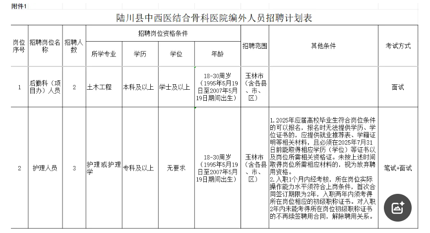 具體相關(guān)專業(yè)崗位條件詳見《陸川縣中西醫(yī)結(jié)合骨科醫(yī)院編外人員招聘計劃表》(附件1)。