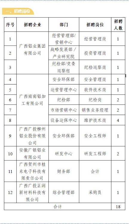 2.報(bào)名方式:應(yīng)聘者可登錄廣投集團(tuán)官方網(wǎng)站(http://www.gig.cn),依次點(diǎn)擊“人力資源-廣納英才”,進(jìn)入“社會(huì)招聘-招聘崗位”專(zhuān)欄,找到“鋁業(yè)”相應(yīng)崗位并投遞簡(jiǎn)歷。