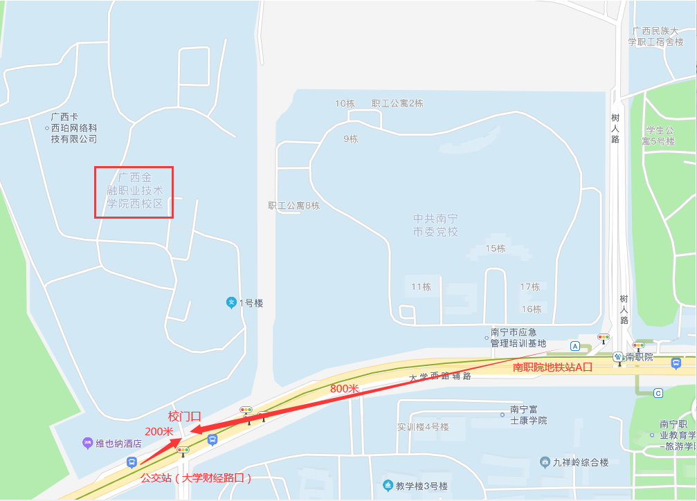 學校位于南寧市西鄉(xiāng)塘區(qū)大學西路168號,可乘坐公交車103路、807路大學財經(jīng)路口下,或乘坐地鐵1號線到“南職院”站A口出站(如圖所示)。