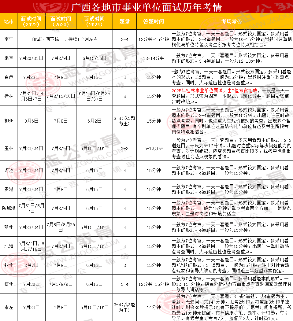 當然,我們還可以根據(jù)歷年廣西事業(yè)單位面試時間參考,推測全部地市是不是集中面試,小志給大家整理了歷年廣西各地事業(yè)單位面試時間、題量、答題時間、考場考務(wù),大家可以從下圖看出。