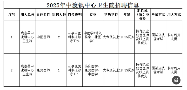 原文標(biāo)題:鹿寨縣中渡鎮(zhèn)中心衛(wèi)生院2025年招聘公告