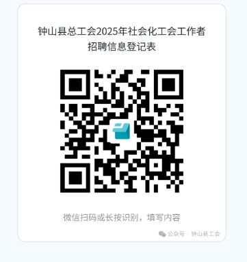 2.報名方式:采取網(wǎng)上報名方式報名。報名時間截止前,有意者請根據(jù)附件1填寫個人簡歷,并用微信掃描下方二維碼打開小程序填寫《鐘山縣總工會2025年社會化工會工作者招聘信息登記表》,上傳個人簡歷、身份證掃描件、學(xué)歷證書掃描件、學(xué)信網(wǎng)教育部學(xué)歷證書電子注冊備案表、榮譽證書掃描件、發(fā)表文章等佐證材料,逾期不再接收任何報送材料。