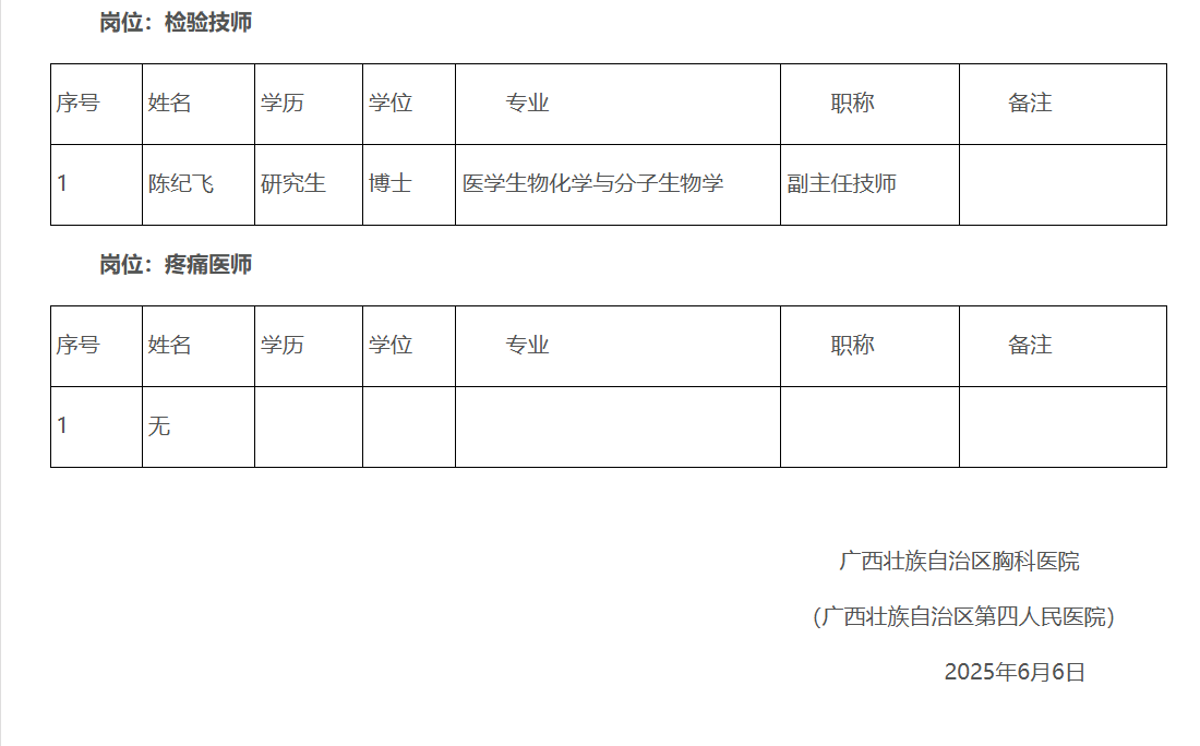 根據(jù)《自治區(qū)胸科醫(yī)院2025年度高層次人才公開(kāi)招聘實(shí)名編制工作人員公告》要求,現(xiàn)將自治區(qū)胸科醫(yī)院2025年度高層次人才公開(kāi)招聘實(shí)名編制工作人員報(bào)名通過(guò)資格審查人員名單公布如下: