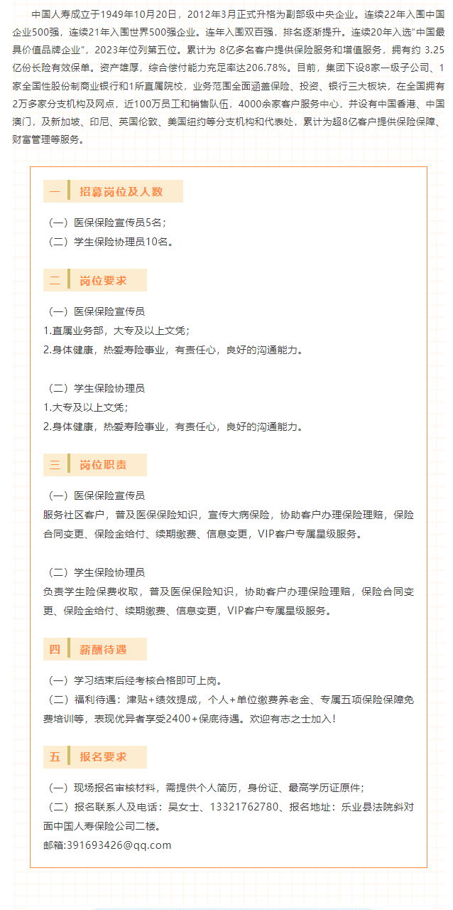 原文標題:中國人壽保險股份有限公司樂業(yè)支公司招募15名工作人員,期待你的加入