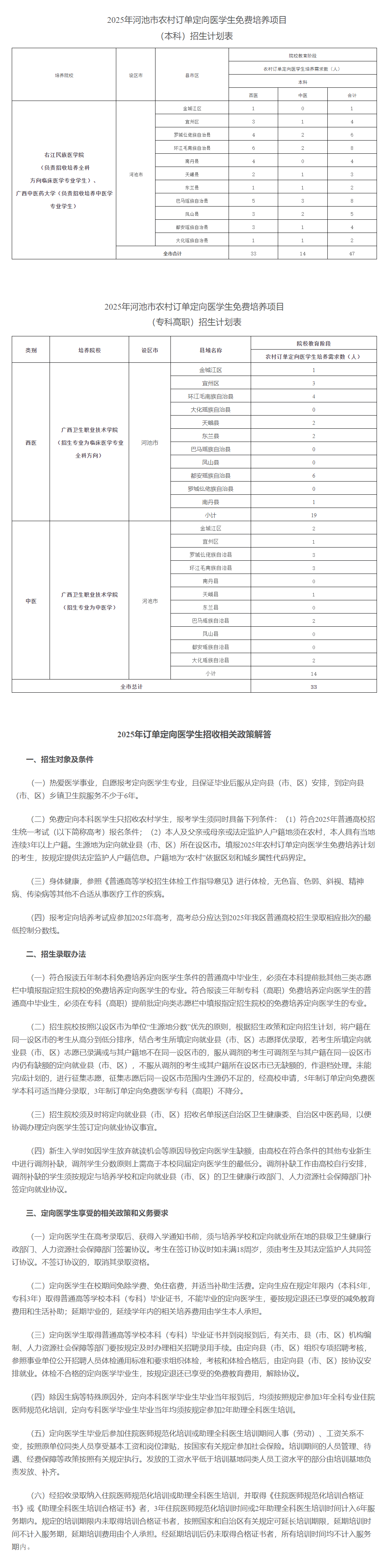2025年,廣西繼續(xù)實施定向醫(yī)學生免費培養(yǎng)項目,面向全區(qū)招生。河池市共有80個名額,其中,本科47個,專科33個,培養(yǎng)院校分別為:右江民族醫(yī)學院、廣西中醫(yī)藥大學、廣西衛(wèi)生職業(yè)技術學院,培養(yǎng)專業(yè)為臨床醫(yī)學和中醫(yī)學。