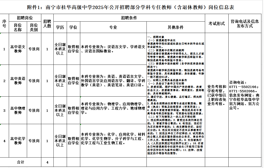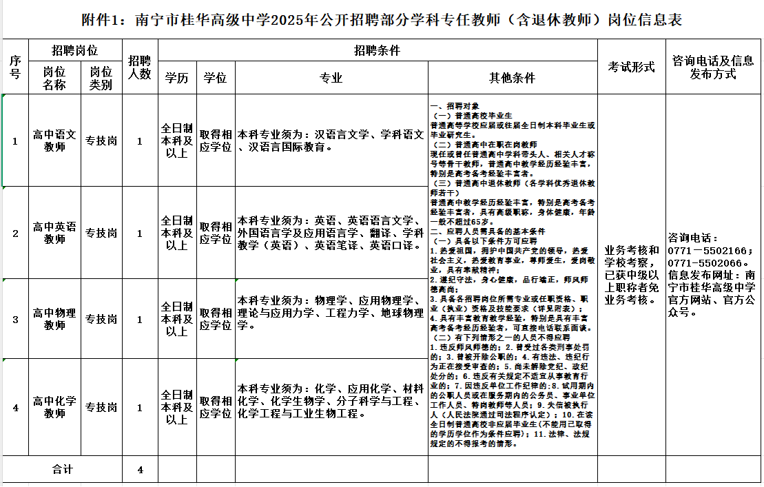 附件1:《南寧市桂華高級中學公開招聘專任教師(含退休教師)崗位信息表》