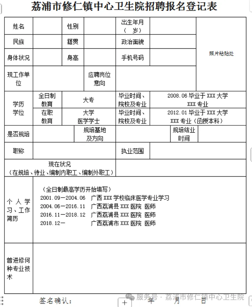 5.其他材料(荔浦市修仁鎮(zhèn)中心衛(wèi)生院招聘報(bào)名登記表)。