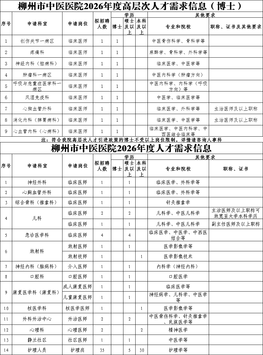 高層次人才不受招聘崗位限制,均可一事一議、一人一議。高層次人才(博士)根據(jù)醫(yī)院引進(jìn)人才制度,給予25萬-120萬元安家費(fèi)、5萬-20萬元科研啟動(dòng)經(jīng)費(fèi)。引進(jìn)的高層次人才(高級職稱或博士研究生)按柳州市有關(guān)政策提供事業(yè)編制,協(xié)助其解決子女入學(xué)和配偶工作。2026年醫(yī)學(xué)類緊缺人才擬招聘醫(yī)師7人,緊缺人才科室為心理科(精神衛(wèi)生專業(yè))、神經(jīng)外科、急診醫(yī)學(xué)科,擬享受柳州市中醫(yī)醫(yī)院人才引進(jìn)醫(yī)學(xué)類緊缺人才安家費(fèi)2-20萬元,同時(shí)按照國家、廣西壯族自治區(qū)、柳州市及醫(yī)院有關(guān)政策享受工資及福利待遇,獎(jiǎng)勵(lì)性績效工資按照醫(yī)院同級同類人員規(guī)定執(zhí)行。如為學(xué)科帶頭人或高層次人才則另按其標(biāo)準(zhǔn)享受相關(guān)待遇。