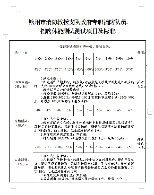 2.體能測試:(1)必考項目:1000米跑;(2)選考項目:①立定跳遠、原地跳高二選一;②單杠引體向上、俯臥撐二選一;③10米×4往返跑、100米跑二選一;(3)注意事項:應(yīng)聘人員須參加體能測試,并當場簽訂《體能測試健康安全風(fēng)險承諾書》,體能測試有兩項及兩項以上不得分的視為不合格(標準參照附件)。未按時參加或因身體原因無法測試者,視為自動放棄。(體能測試測試項目及標準附后)