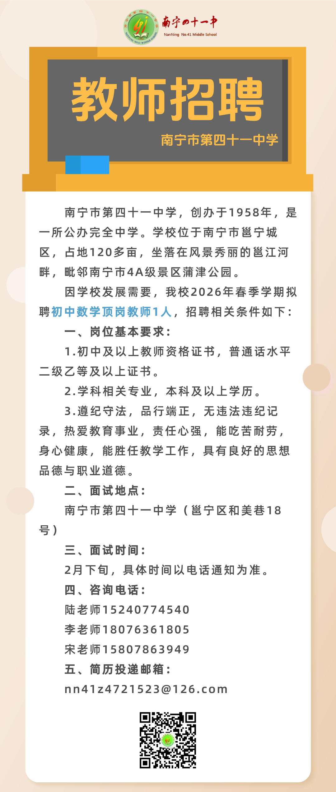 原文標題:2026年春季學期南寧市第四十一中學關于公開招聘頂崗教師的啟事