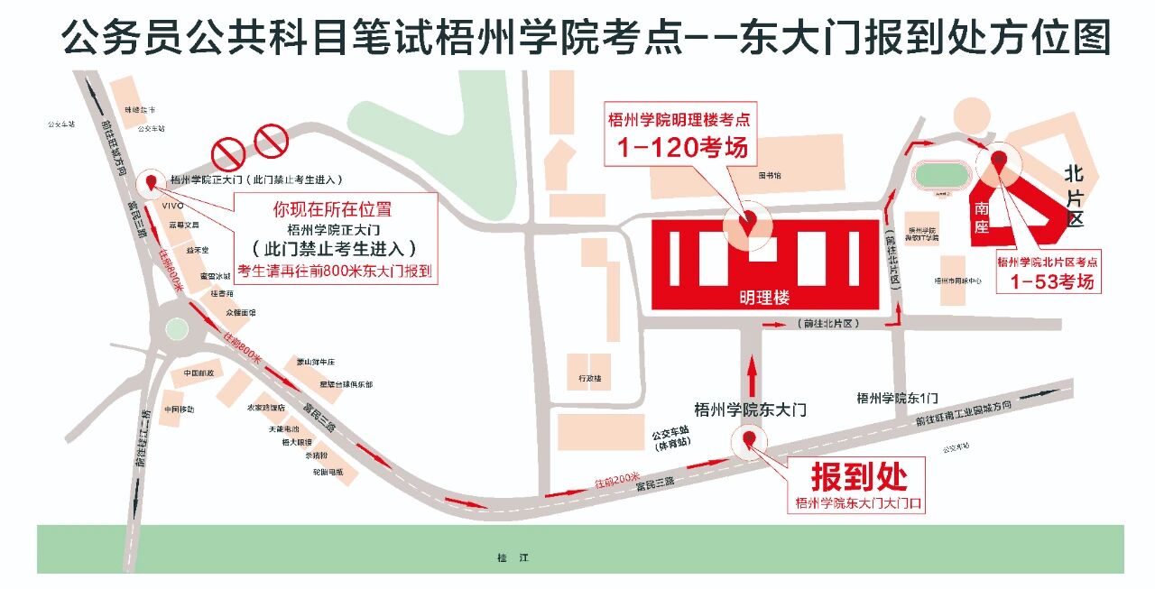 (九)梧州學(xué)院明理教學(xué)樓、梧州學(xué)院北片區(qū)(萬秀區(qū)富民三路82號)特別提醒:明理教學(xué)樓和北片區(qū)屬不同考點(diǎn),請考生看清楚準(zhǔn)考證,切勿走錯考場。