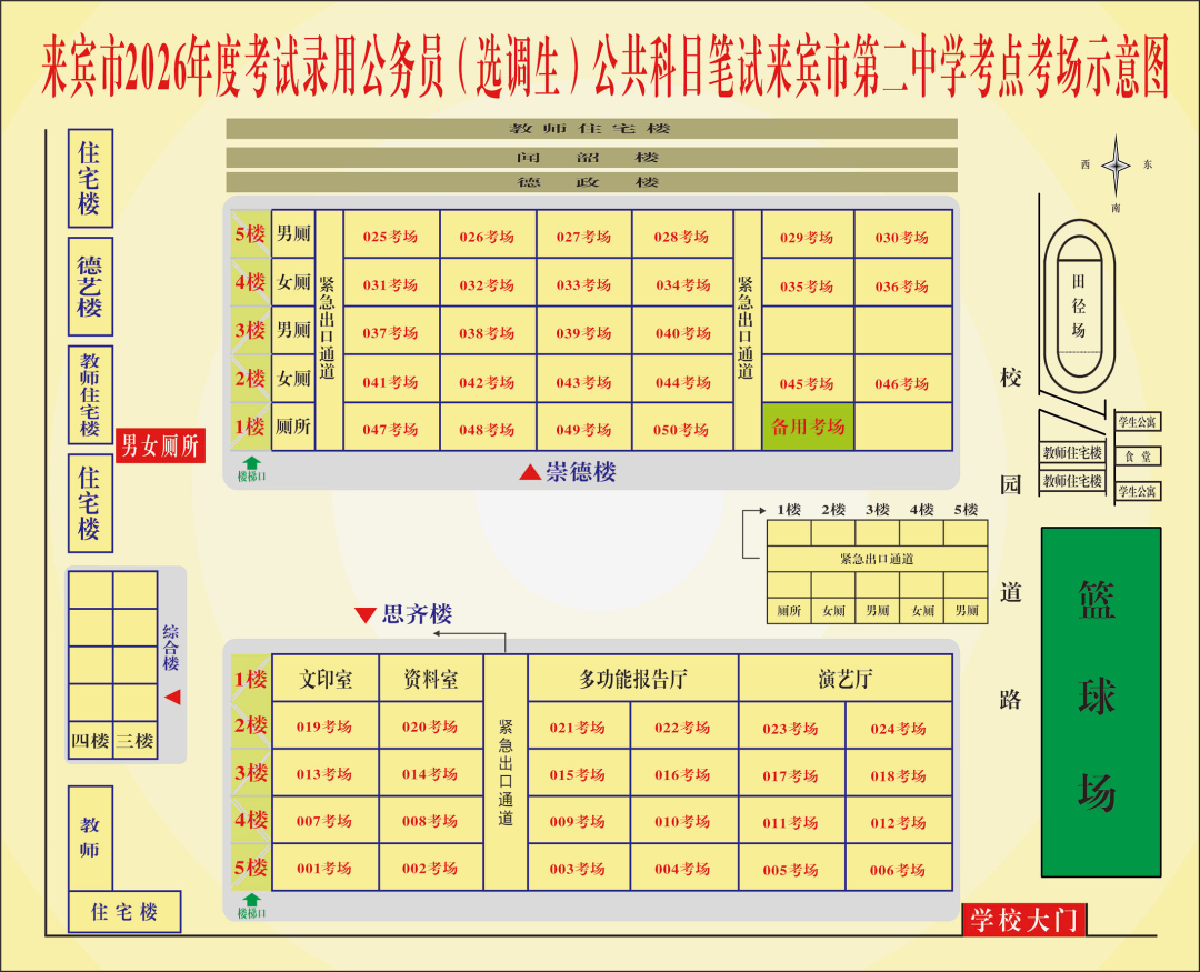(一)來賓市第二中學(xué)考點(diǎn),地址:興賓區(qū)北四路62號??键c(diǎn)考場示意圖如下:(校門口的城市道路易擁堵,注意合理安排進(jìn)場時(shí)間)