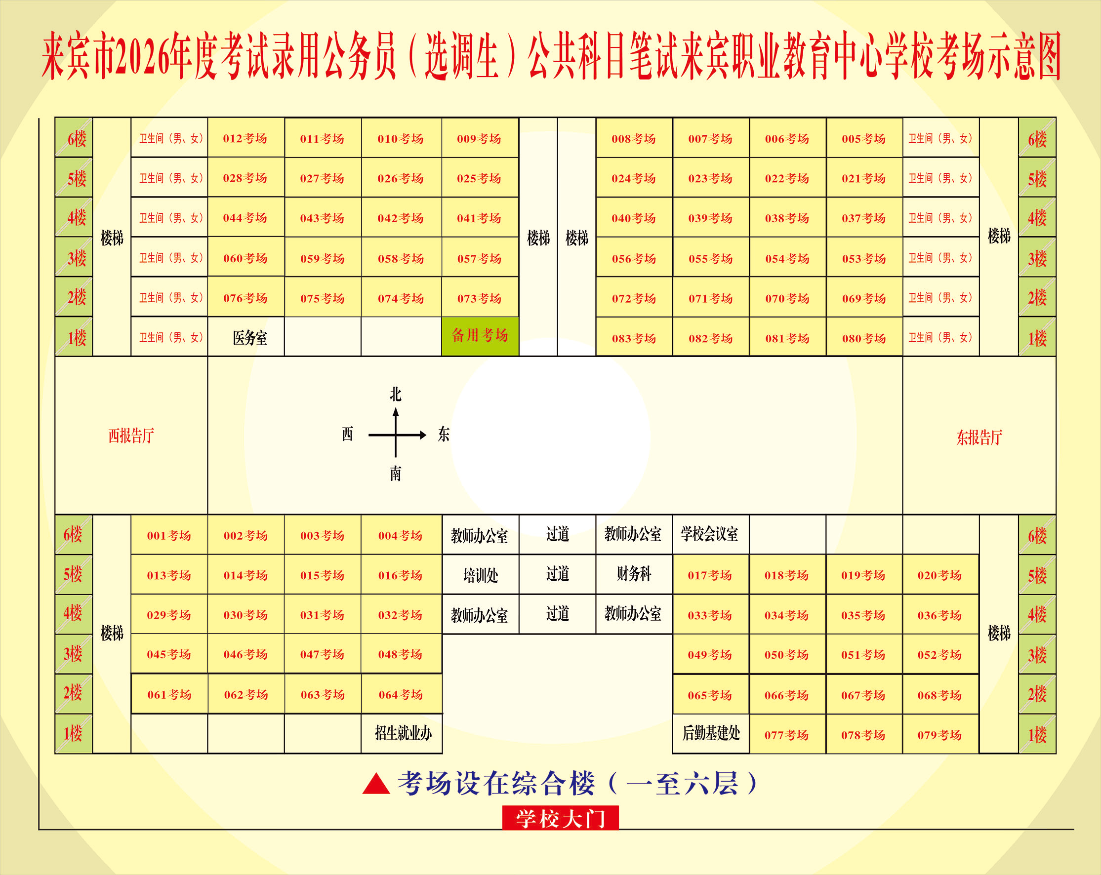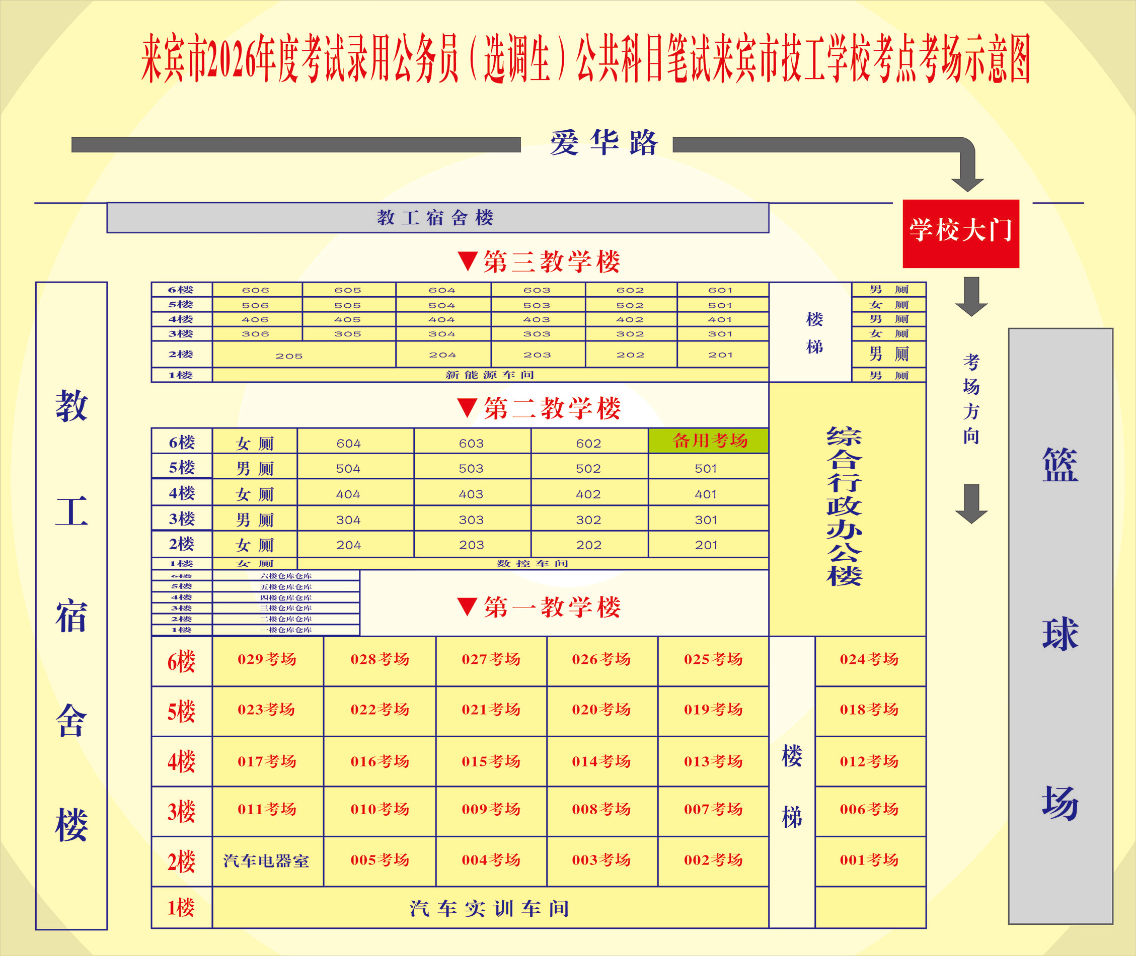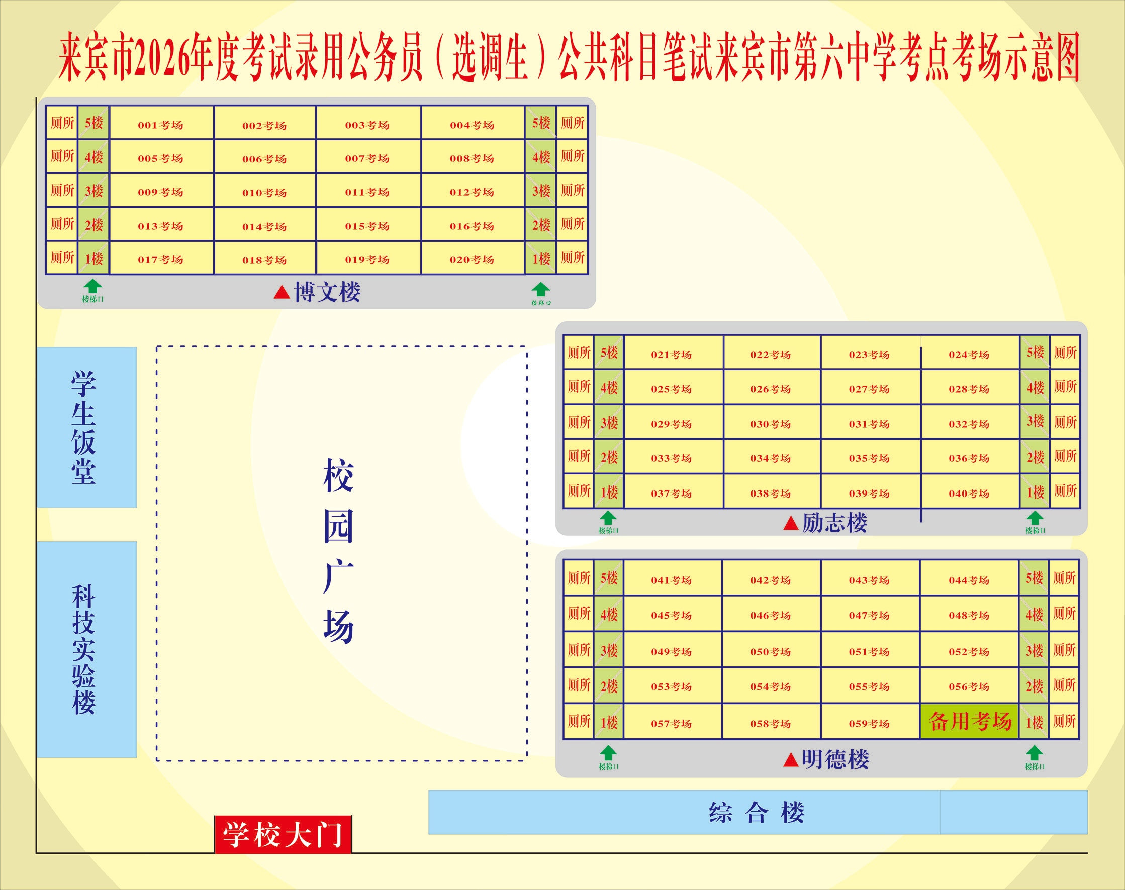 (二)來賓市第六中學(xué)考點(diǎn),地址:興賓區(qū)政和路北178號??键c(diǎn)考場示意圖如下: